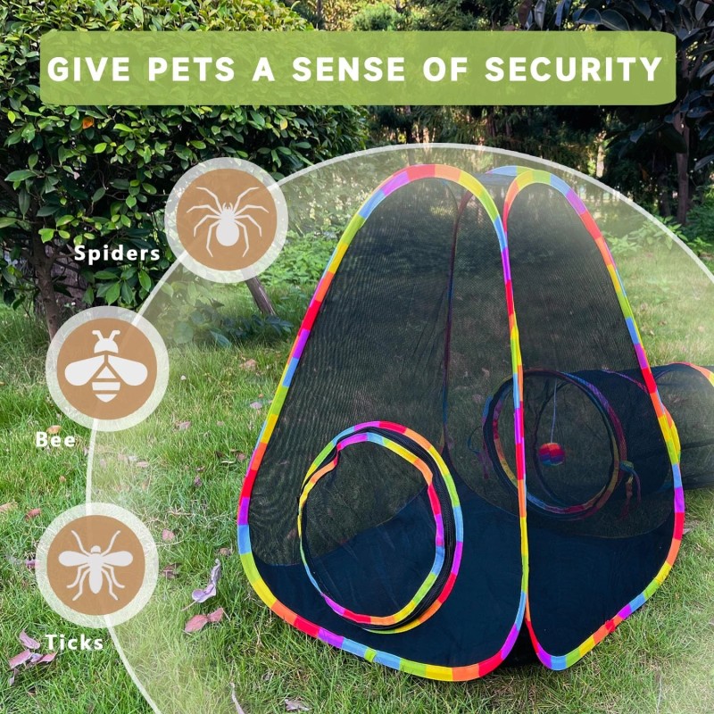 【Flexible Combinations】The outdoor cat enclosures includes tent, cube and tunnel, The cat tunnel can link to cat tent by zipper for cats to play. Cat cube and cat tunnel can be used together or separately. Hanging balls and bells are placed at the exits, providing interactive entertainment and encouraging daily exercise to keep your pet active.