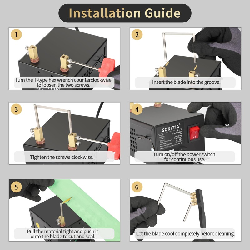 - 【Package Includes】30W GONYTIA electric rope cutter × 1,Cutting Blades × 2,Hex Key × 1,Cleaning Brush × 1,Wooden Handle Scraper × 1