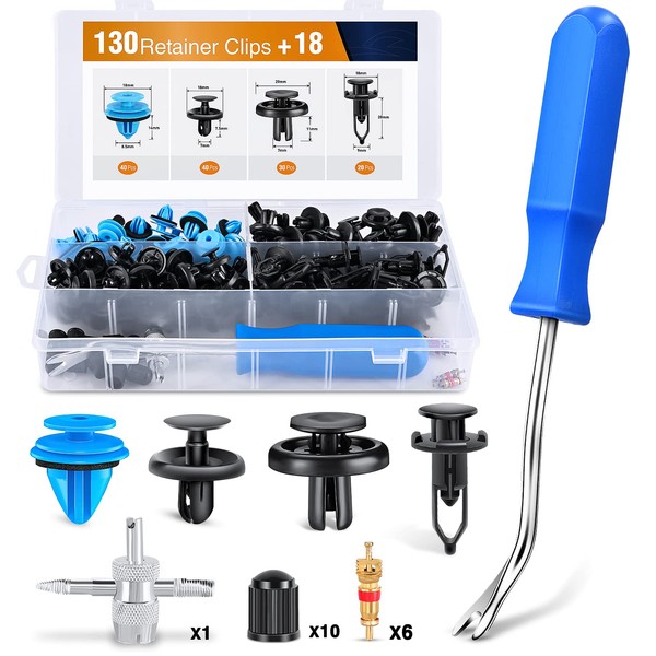 - Package:Including 130pcs Push-Type Retainer Clips, 1pc Fastener Remover, 1pc 4-Way Valve Tool, 10pcs Tire Valve Caps, 6pcs Tire Valve Cores with a portable box