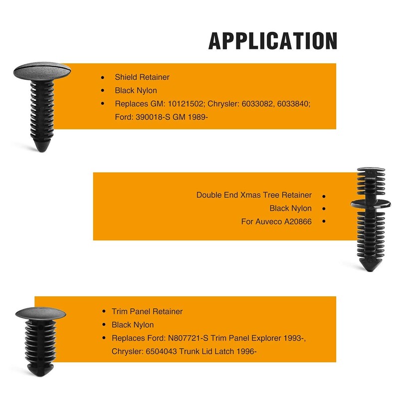 • Fender & Bumper Shield Retainer ,Replaces for GM: 1595864, 1605396; for Chrysler: 6030441; for Ford: 388577S, W705589-S300