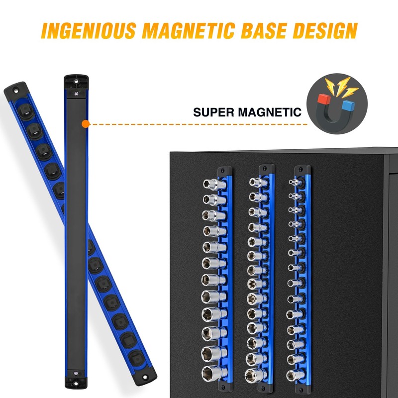 - MAGNETIC SOCKET RAIL: With a magnetic design on the back of this 1/4" 3/8" 1/2" socket holders set, it easily attaches to any metal surface and the sockets will not fall out, even if the socket rail is turned upside down. The socket storage rails can also be hung on pegboard, tool carts, or walls for easy access to sockets without taking up too much space