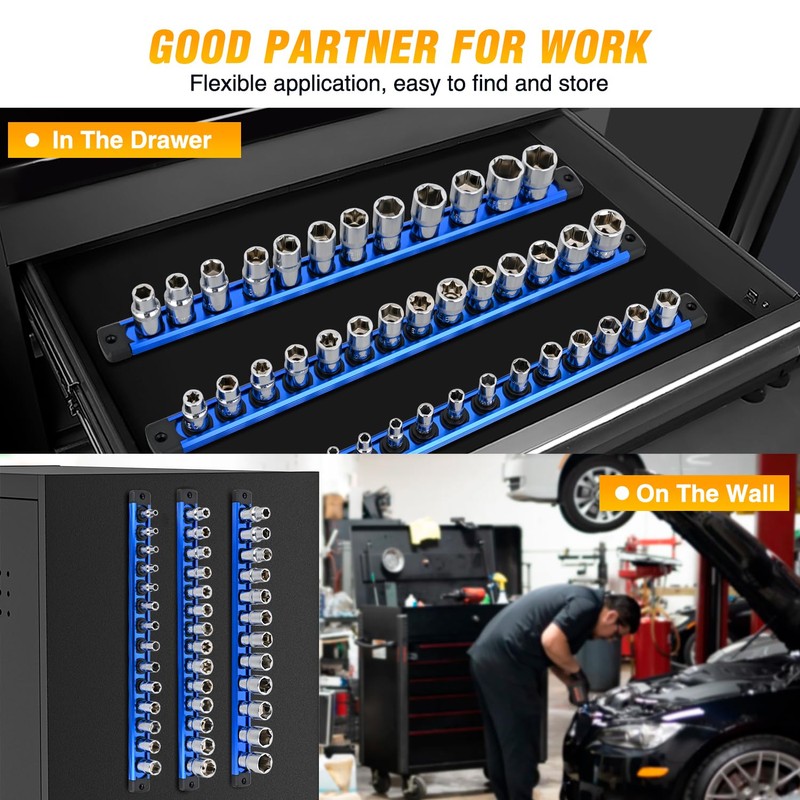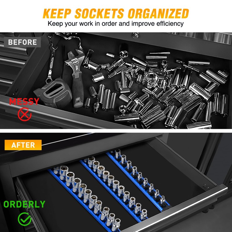 - EFFICIENT STORAGE: The magnetic socket organizer neatly stores a large number of sockets in a compact space. The strong magnetic back design allows it to be easily attached to tool cart sidesor any metal surface, or hung on walls and hooks, or placed in a tool cart drawer. Ensuring that you can quickly access the tools you need while working, thereby maximizing space savings and requiring no complicated installation