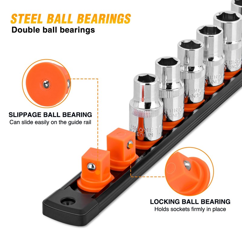 - STURDY & DURABLE: This socket rail organizer is made of strong magnetic strip and heavy-duty aluminum and high-quality ABS spring clips with steel ball bearings, ensuring that the socket is firmly stuck on the socket rail holder. The socket rails and magnetic backing are strong and not easy to deform. The 360° swivel clips supports a variety of metric and SAE size sockets, which is convenient for taking and placing from any direction