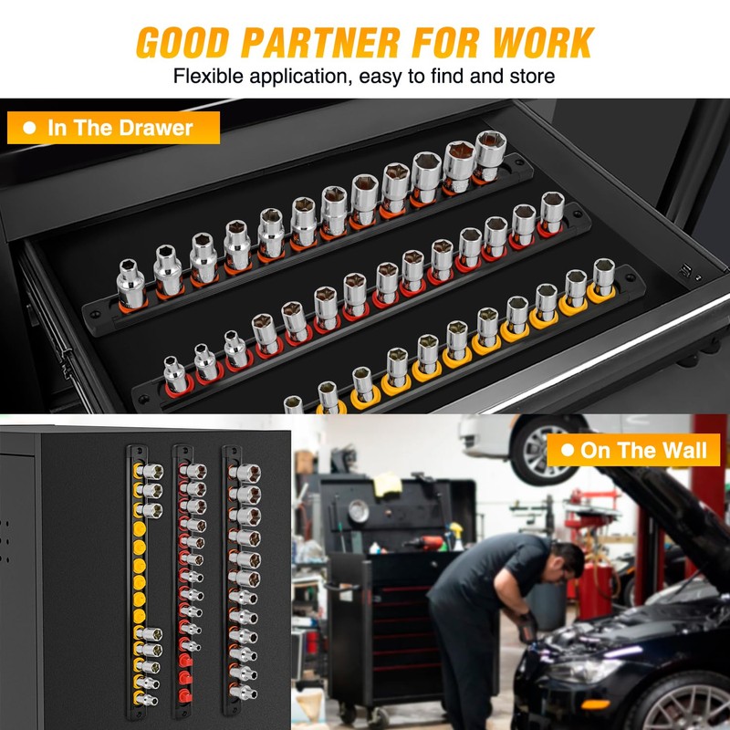 - EFFICIENT STORAGE: The magnetic socket organizer neatly stores a large number of sockets in a compact space. The strong magnetic back design allows it to be easily attached to tool cart sidesor any metal surface, or hung on walls and hooks, or placed in a tool cart drawer. Ensuring that you can quickly access the tools you need while working, thereby maximizing space savings and requiring no complicated installation