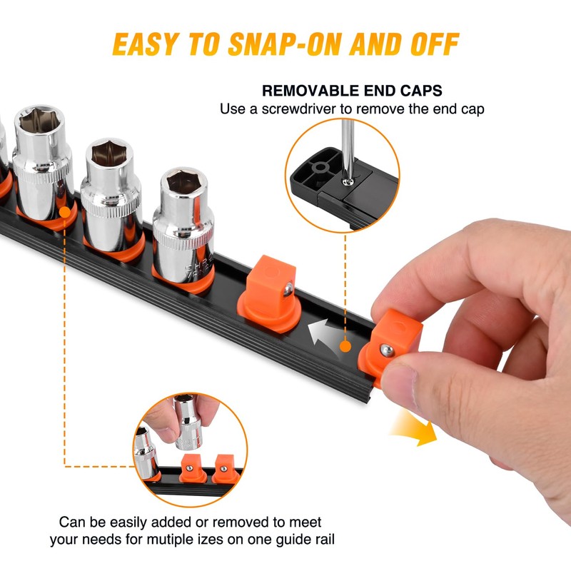 - REMOVABLE CAPS DIY DESIGN: The caps on both sides of the socket rail prevent the socket organizer clips from sliding, and can be easily and quickly opened for convenient removal or addition of replacement clips. Interchange clips as needed, accommodating a mix of three socket sizes on a single rail without hassle, allowing you to DIY create a personalized socket holders