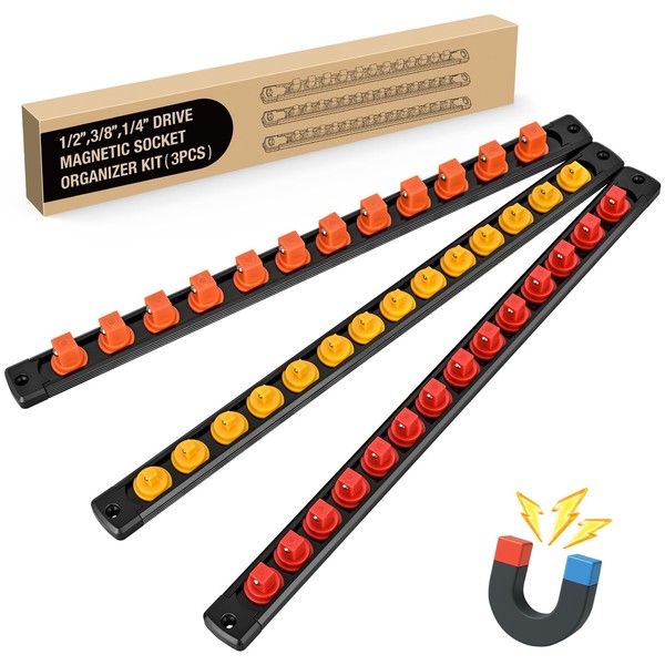 - MAGNETIC SOCKET RAIL: With a magnetic design on the back of this 1/4" 3/8" 1/2" socket holders set, it easily attaches to any metal surface and the sockets will not fall out, even if the socket rail is turned upside down. The socket storage rails can also be hung on pegboard, tool carts, or walls for easy access to sockets without taking up too much space