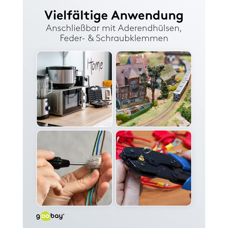 - Insulated wiring cable can be connected with wire end ferrules, spring clamps and screw terminals; easy identification and organisation of the wires thanks to different colours