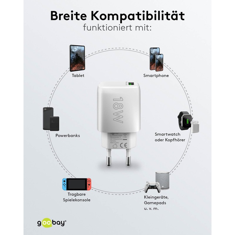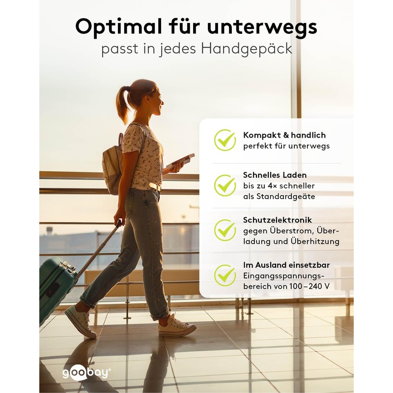 - Thanks to its input voltage range of 100-240 V, the goobay USB-C power supply can also be used abroad