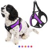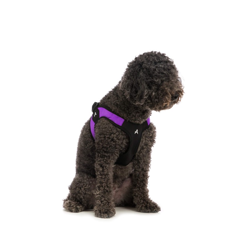 - Escape Free Purple Dog Harness - Our Escape Free Easy Fit dog harness no pull design reduces space around the back making harder for your dog to escape our no pull harness by backing away during the walk. Make sure our no pull dog harness is properly sized by checking to see if there is no space around the back of your dog when the harness is pulled fully. Incorrect sizing will lead to escaping of the harness.