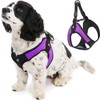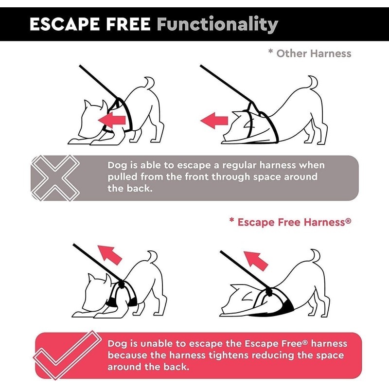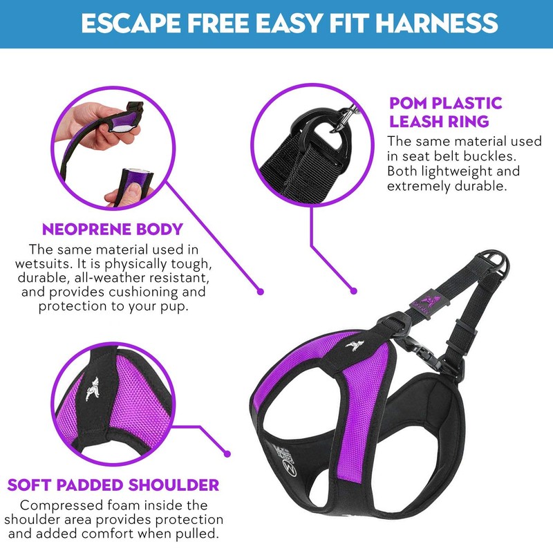- Escape Free Purple Dog Harness - Our Escape Free Easy Fit dog harness no pull design reduces space around the back making harder for your dog to escape our no pull harness by backing away during the walk. Make sure our no pull dog harness is properly sized by checking to see if there is no space around the back of your dog when the harness is pulled fully. Incorrect sizing will lead to escaping of the harness.