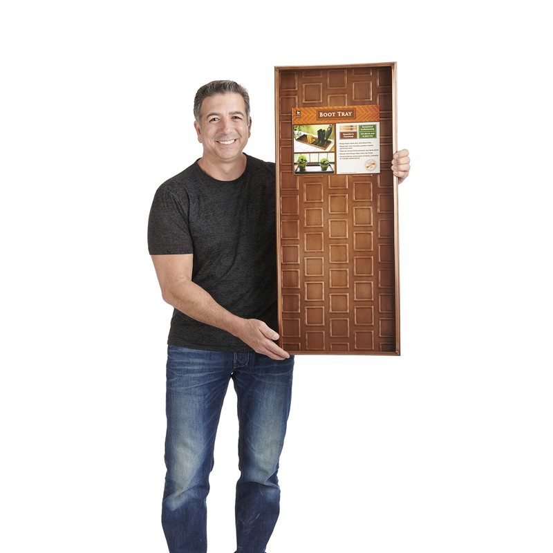 This multi-purpose boot tray is as versatile as it is attractive! Raised- relief designs help items dry faster and will match any interior decor. Use it as a boot tray for your entryway, mudroom, or any other area of the home to keep floors neat and clean. Additionally, use it as an attractive home for your potted plants or a neat, no-mess zone for your favorite furry friend's pet bowls! The possibilities are endless. The multi-purpose boot tray has a powder coated, galvanized steel construction with a copper finish and features a circle design inside the tray. The tray is 34-inch L by 14-inch W by 2-1/2-inch H and can store approximately 3 pairs of adult boots or shoes.