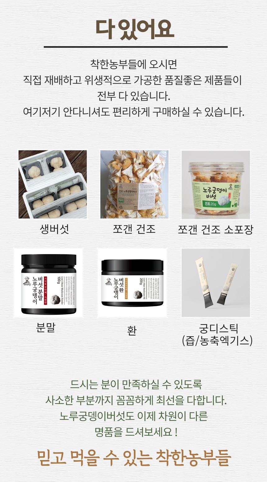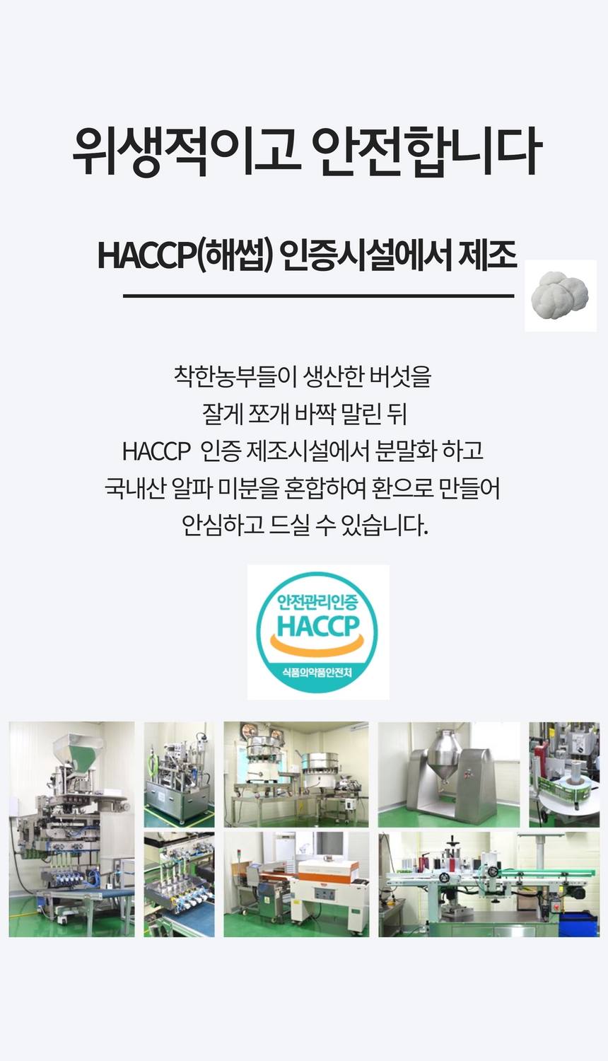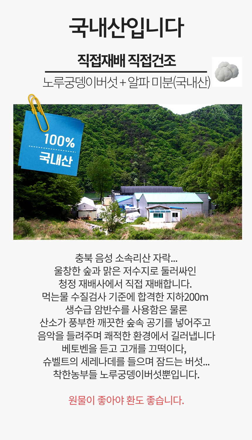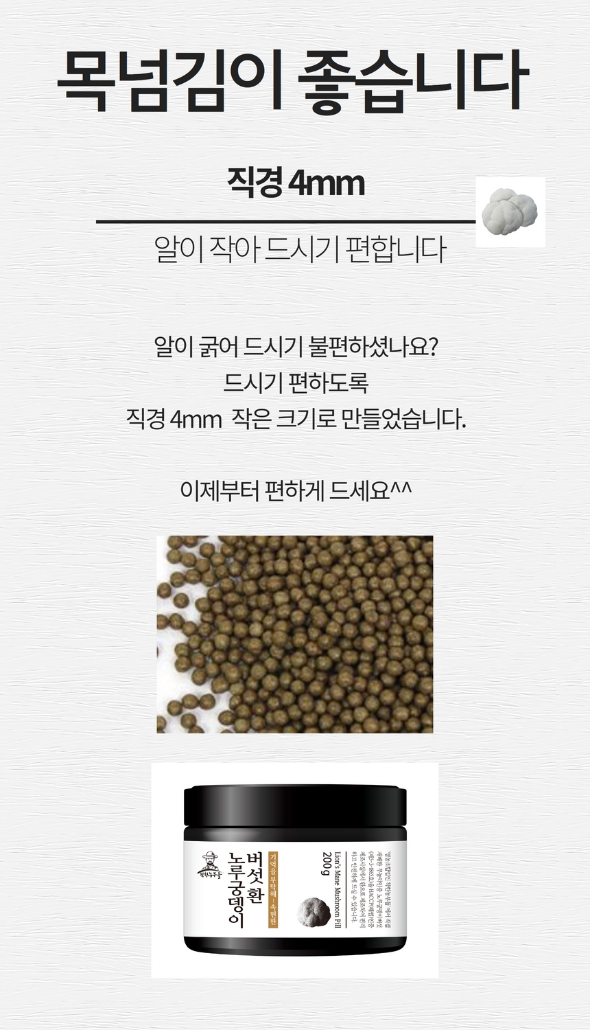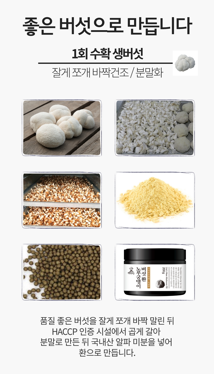 - 원(재)료명 및 함량: 노루궁뎅이버섯 분말(국산) 95%, 알파 미분(국산)5%