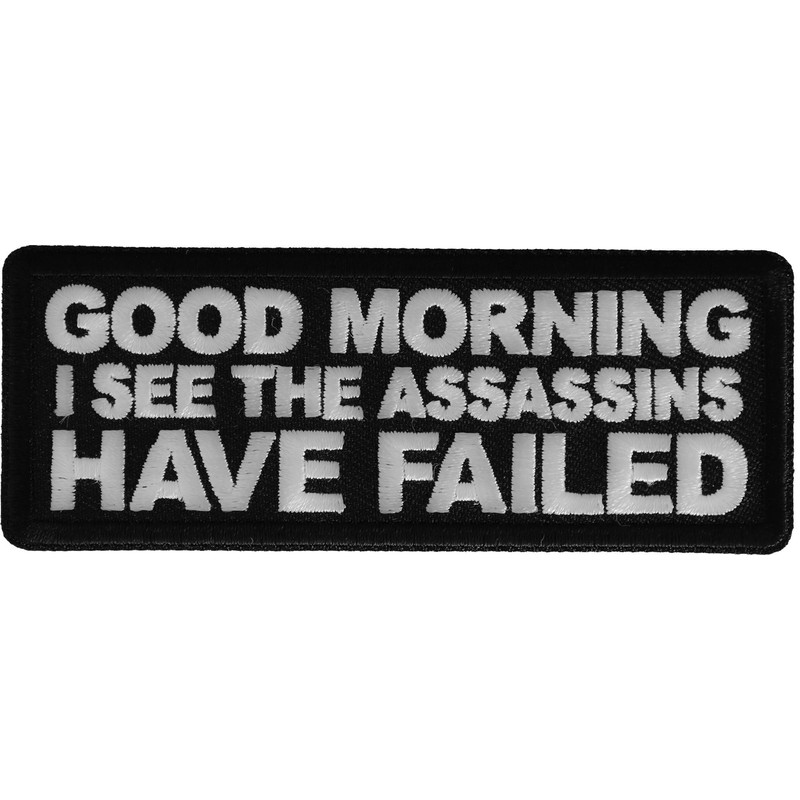 Good Morning I See The Assassins Have Failed Patch - 4x1.5 inch - Embroidered Iron on Patch (P6802)