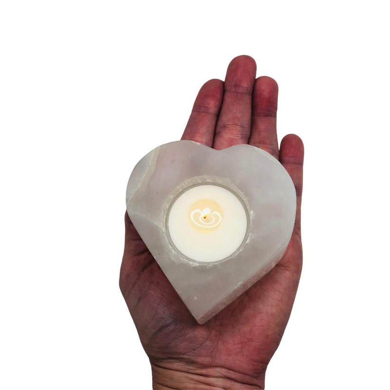- 1 Selenite Crystal Heart Tealight Candle Holder : white healing stone, strong protection powers. The crown Chakra is associated with the Selenite stone and aside from this you can use Selenite to contact your Guardian Angel or Spiritual Guides.