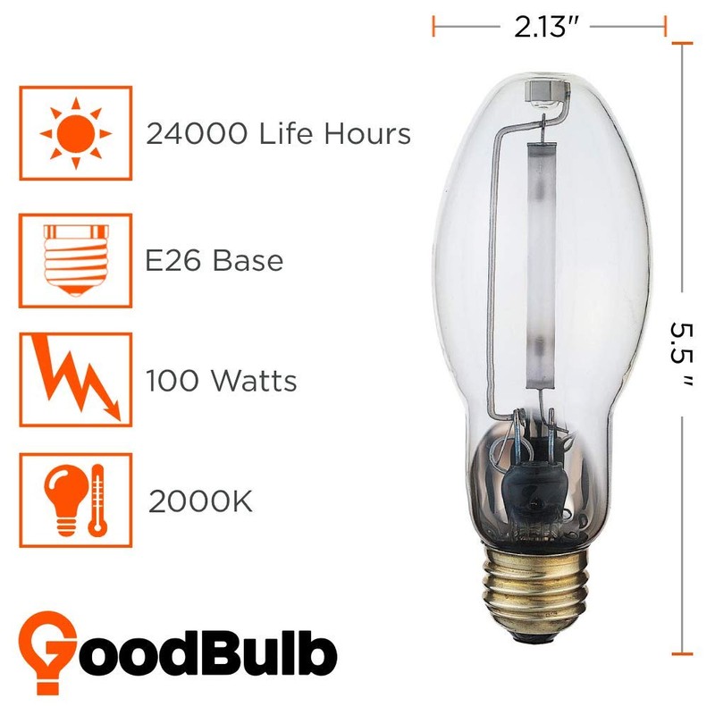 GoodBulb 100-Watt High Pressure Sodium HID Light Bulb | E26 Base ED17 ANSI Code S54 | High Output HID Light | 2000K Warm White Light Color | Clear Finish | 24000 Life Hours (Pack of 2 Bulb)