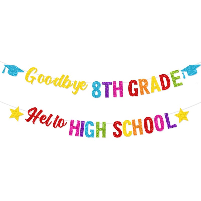 - Glitter Goodbye 8TH Grade Hello High School Banner for 8th grade graduation decorations, last day of 8th grade decorations