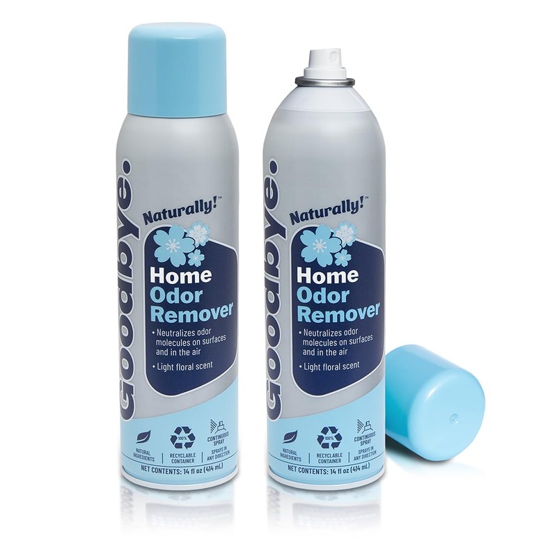 - Two 14oz cans of Goodbye Naturally! Home Odor Remover, odor neutralizer spray, light floral scent