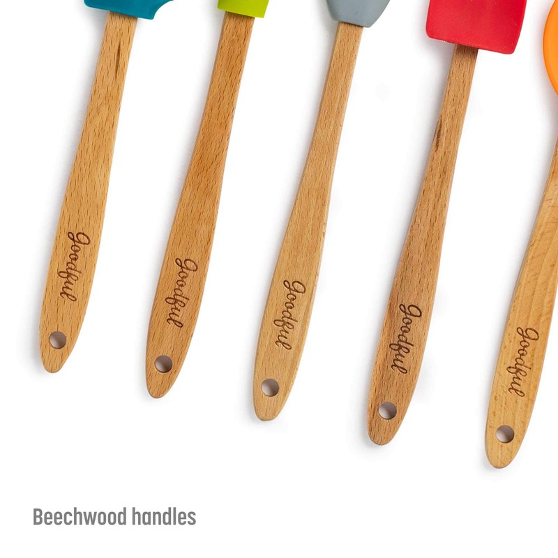 Goodful Silicone and Beechwood Mini Kitchen Utensil Set, Great for Cooking, Baking or Reaching Into Small Jars, Easy to Clean, Safe for Non-Stick Cookware, 3 Spatulas, Spoon, Basting Brush, Multicolor
