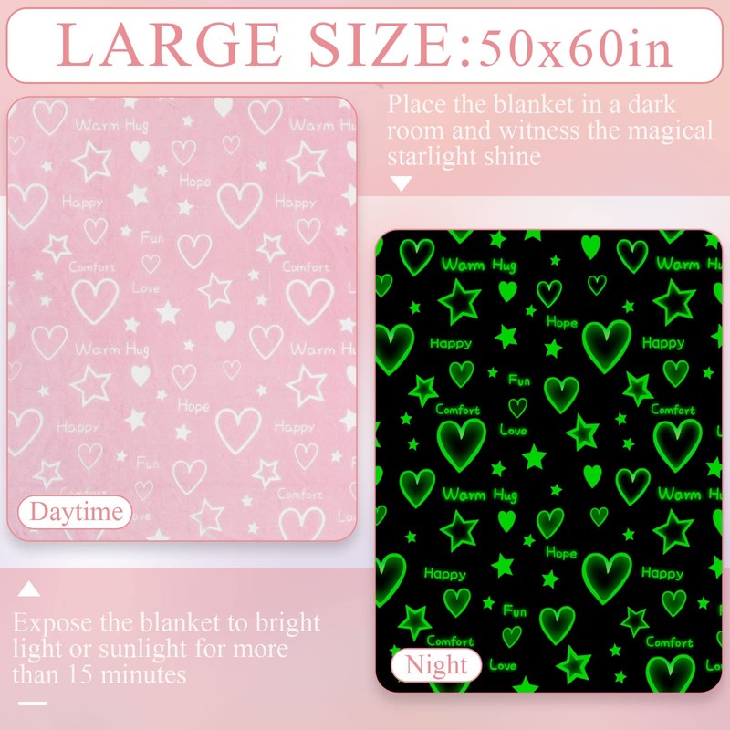 - Unique Nightlight Blanket Our blanket has a pattern of stars and love heart, which can glow in dark 2-3 hours after bright light or sunlight for 15-30 minutes. Cute pattern is loved by kids, special nightlight features allowing the stars and love to wrap around your baby through the night
