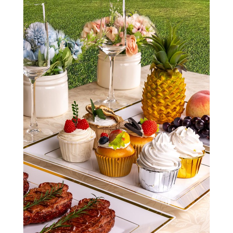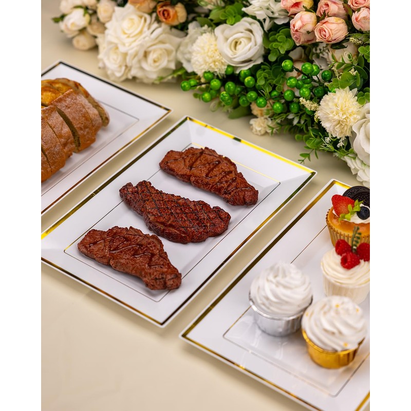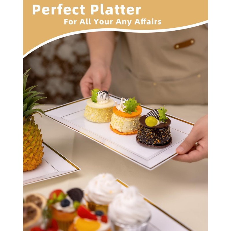 - Elegant Design & Multipurpose: Featuring a bright white finish with a refined gold rim, each tray elevates your presentation with a sophisticated flair. Use these elegant serving trays as serving dishes for cheeses, desserts, or even a fruit tray display. The sleek look complements any theme, making them perfect for upscale buffets, garden parties, or holiday gatherings.