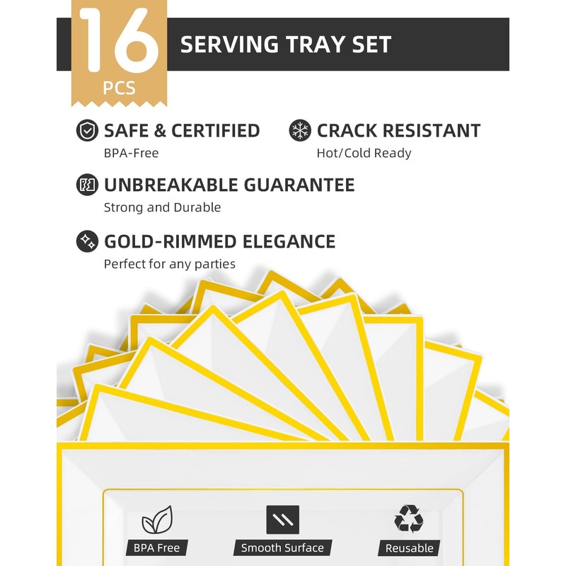 GoodLuck 16 PCS Plastic Serving Trays for Party, Gold Rim Disposable Serving Platter, Plastic Tray for Food Fruit Trays for Serving for Party, 12.85 x 8 inches