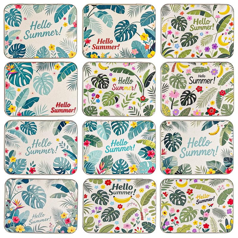 - Contains a total of 12pcs empty rectangular silver metal tins with hinged lids, each tin with custom designed Hello Summer themed tropical plant green palm leaves & flowers image pattern printed on the lid.