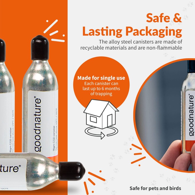 - Carbon Dioxide Canister - Goodnature’s compressed CO2 canisters provide the ultimate power for your mouse traps; The potent canisters are made to power up your mouse traps to allow them to strongly strike on pests such as rats and mice