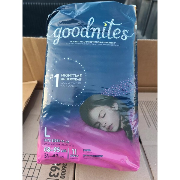 This is a pack of GoodNites girls' nighttime bedwetting underwear in size large, which fits girls weighing between 65-95 pounds. The package contains a total of 44 pieces, perfect for parents who are potty training their daughters. These training pants are designed to help prevent nighttime leaks, providing comfort and protection throughout the night. They are specifically tailored for girls and come in a fun and colorful design that your child will love. If you're looking for an effective and convenient solution for bedwetting, these GoodNites training pants are an excellent choice.