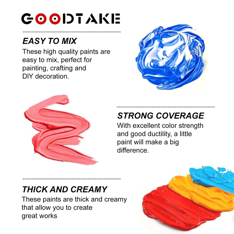 - Economical Packaging - Craft Paint offered in a 7 fl oz /200ml size, meeting extended painting needs with exceptional value for money. GOODTAKE Acrylic paints for art dry quickly and stay on surfaces extremely well, permanent, waterproof and fade resistant.
