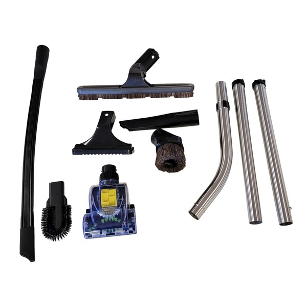 Includes: 1x Floor tool, 1x Dusting Brush, 1x Upholstery tool, 1x Crevice tool, 1x Stainless Steel Top Pipe, 2x Stainless Steel Middle Pipe, 1x 25” Flexible Crevice Tool, 1x Turbo Brush
