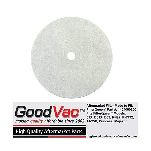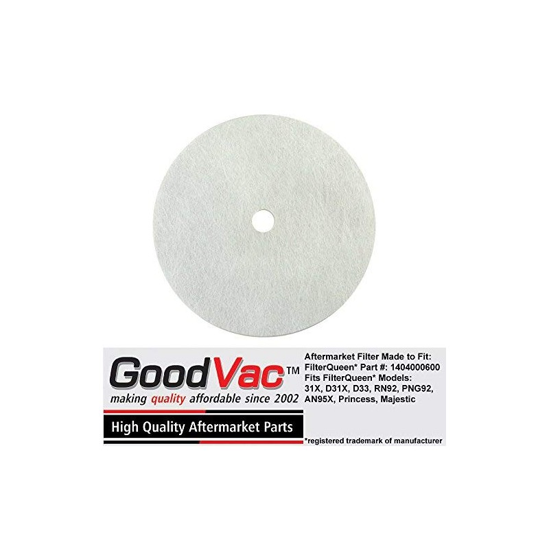 Aftermarket FilterQueen Secondary Paper Motor Guard Filter Disc by GoodVac Replaces Filter Queen OEM Part Number: 1404000600 One motor guard, secondary motor filter disc to fit Filter Queen vacuums. Compatible with the following Filter Queen models: 31X (Brown) With Power Nozzle 48 or 88, D31X (Brown) With Power Nozzle 48 or 88, D33 (Brown) With Power Nozzle 48 or 88, RN92 (Gray) Princess With Power Nozzle 48, PNG92 (Gray) Princess With Power Nozzle 48, AN95X (Dark Gray) Majestic With Power Nozzle 96, AN95X (Dark Gray) Majestic With Power Nozzle 96 Ca