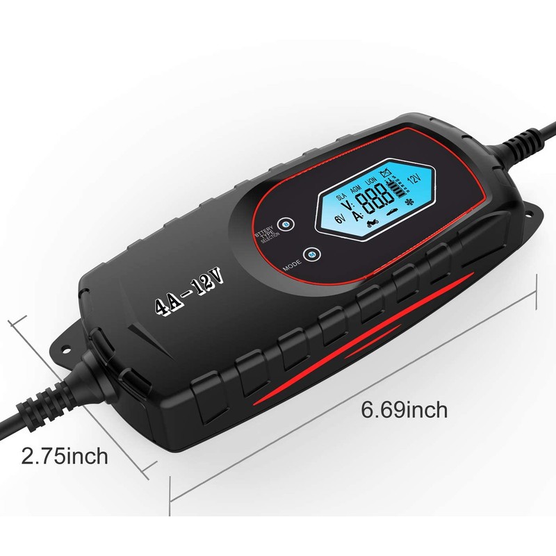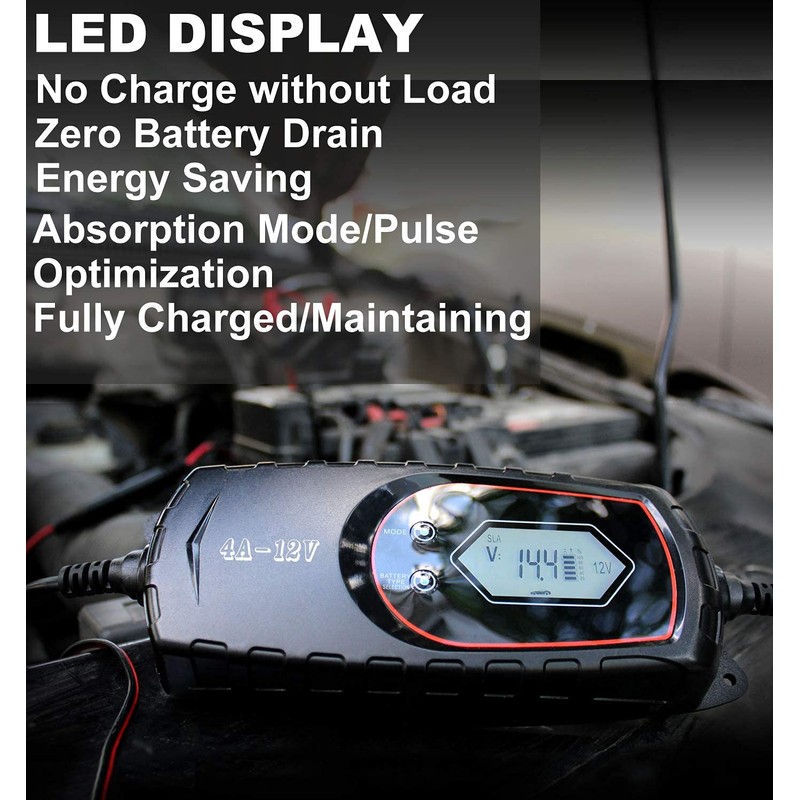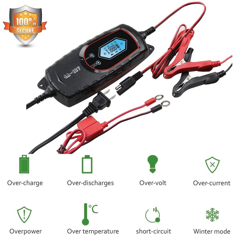 - ✔【Visual LCD Display】The battery charger offers state-of-charge feedback and diagnostic information clearly, even when in maintenance/float mode. Moreover, the DC output cable with ring and clip connectors can steady connect on the battery polarities.