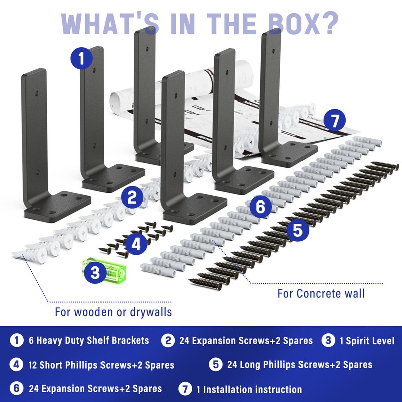 - 【Complete Accessories & Easy to Install】Boards is no included. Provide all the screws needed for different wall mountings, and extra spare screws are prepared for unexpected situation. They can achieve strong grip on wall surface. And a spirit level is also included to measure as well as keep the shelf hardware balanced during installation. Detailed installation instructions are provided. Just follow the steps, this wall mount shelf bracket can be installed even by someone without experience.