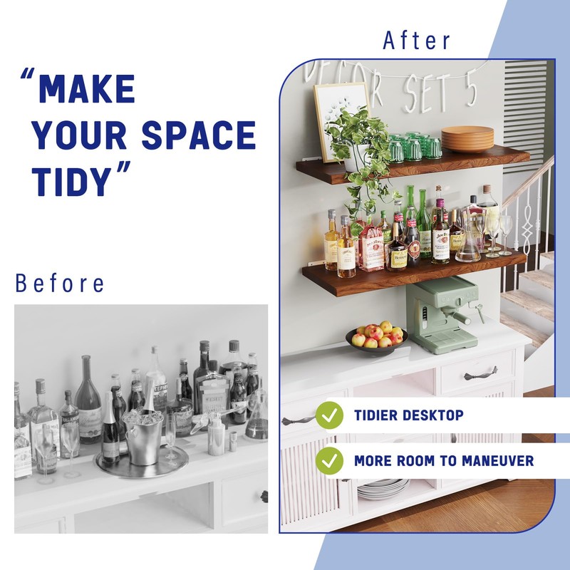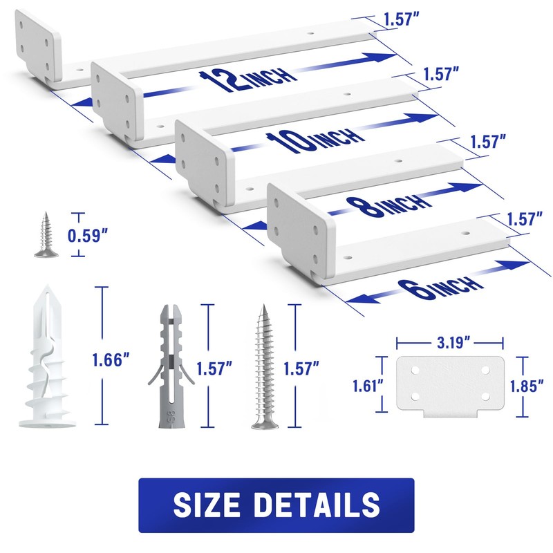 - 【Unrestricted Space Usage】We provided 6in, 8in, 10inch and 12inch brackets for floating shelves. Pick the right bracket or use it in combination depending on the actual space or the size of the planks. Hanging shelf bracket is not limited to kitchen use only, is also for living rooms, bedrooms, bathrooms, storage rooms, utility rooms, checkrooms, laundry room and corners to store green plants, photo frames, handwork, books, toiletries, storage baskets, sundries or to be a cat climbing frame.