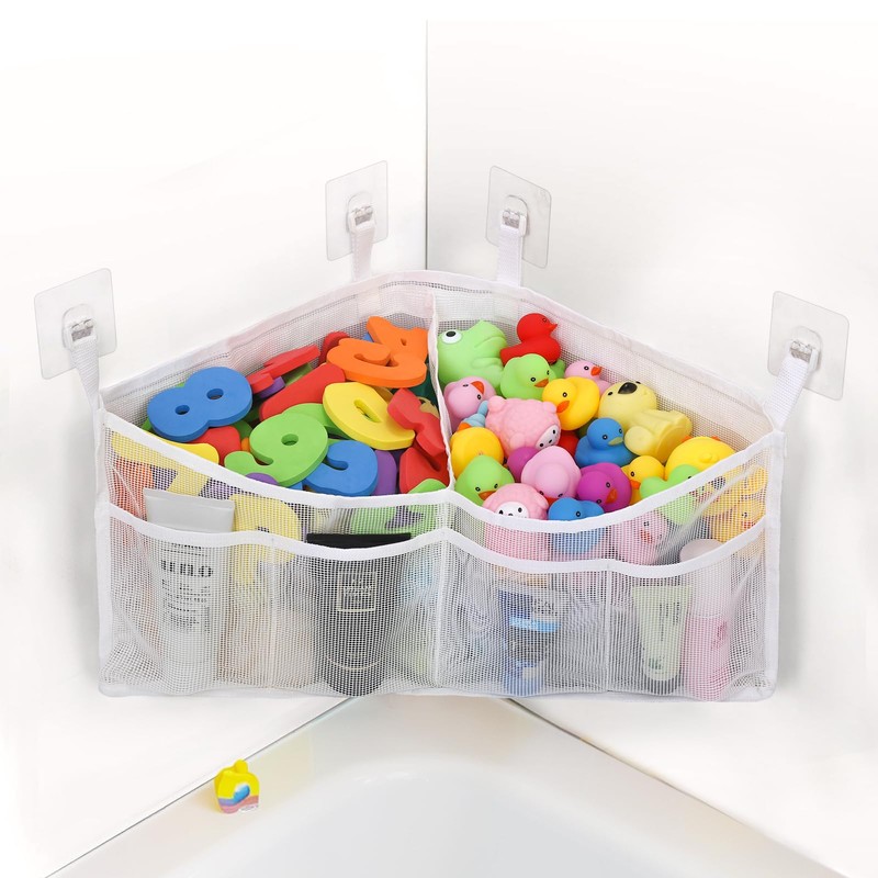 - [LARGE CAPACITY TOY ORGANIZER]: The corner bath toy holder has 2 compartments with 4 side pockets, it can store all kids' bathroom toys and other bath essentials, keep your bathroom clean and tidy!