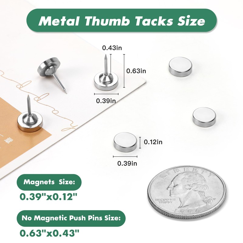 - 【Package Includes】You will get 60 sets of silver thumbtacks. A sufficient quantity can meet your different needs, and these are a great alternative to pins or tape. The pin part of the push pin is thicker and more sturdy than your standard push pins. In addition, the no magnetic thumbtacks and magnets are packed separately in two plastic boxes for your convenience in taking and storing.