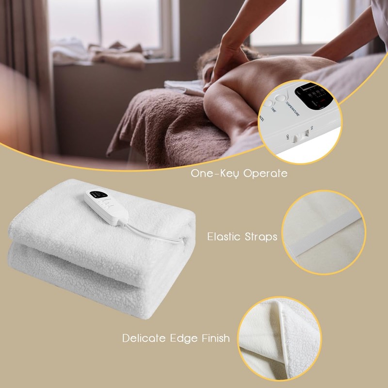 • Wide application & Flexible Long Cord: The massage table warming sheets measure 71” X 31”, and not only fits most massage beds, but is also very suitable for use on a mattress. 2 elastic straps ensure a perfect fit and stability on the massage table. The flexible 12ft controller cord is on top of the pad for easy connection to a distant electrical outlet.