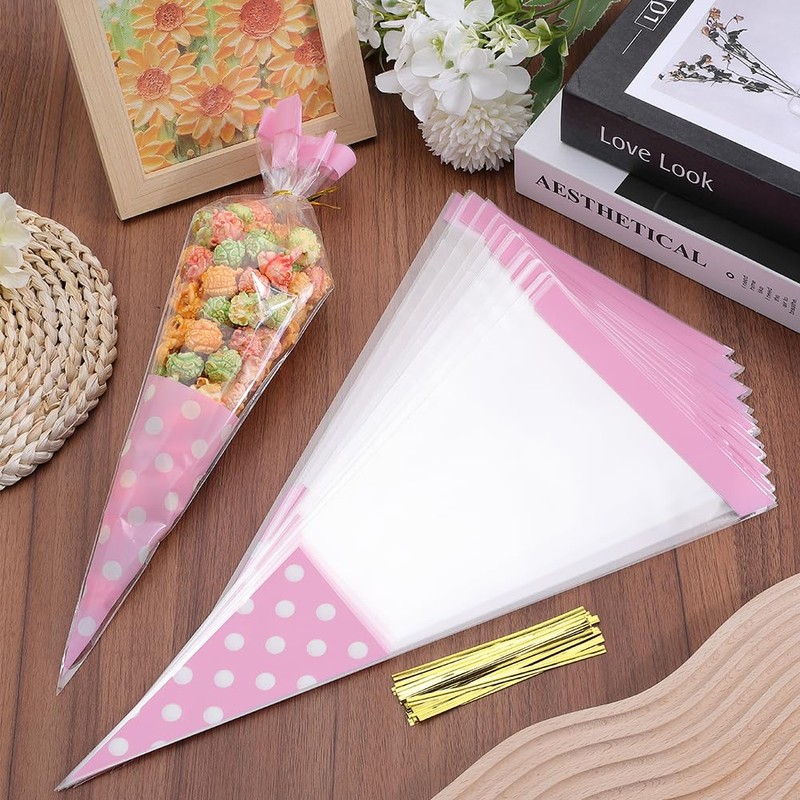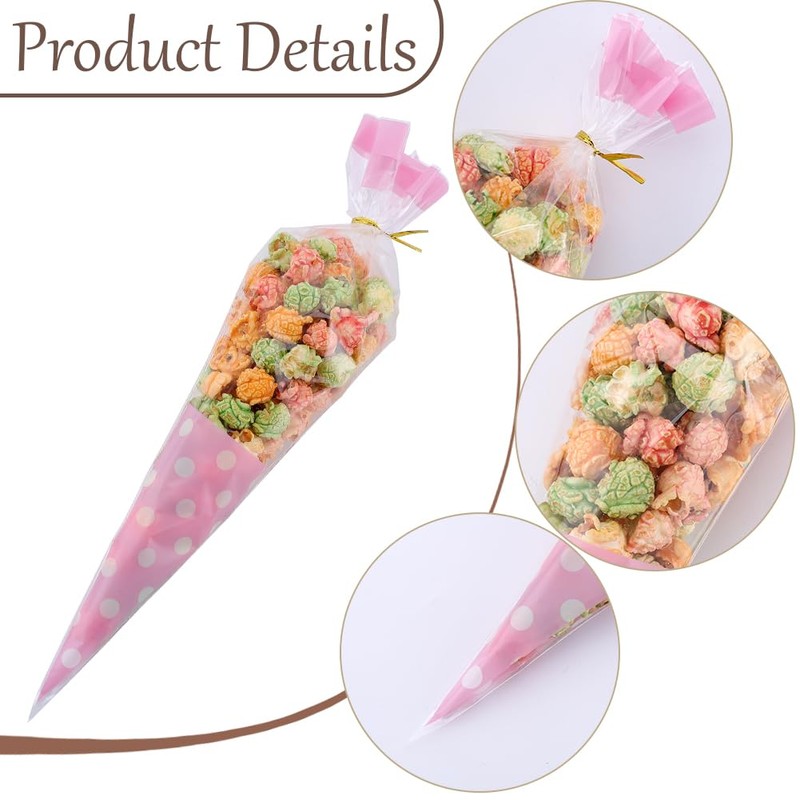 - [100Pcs Cone Candy Bag]: Comes with 100pcs cone candy bags, each is 7.01x14.29inch(17.8x36.3cm), 100pcs x twist tie: 3.9x0.16inch(9.9x0.4cm).