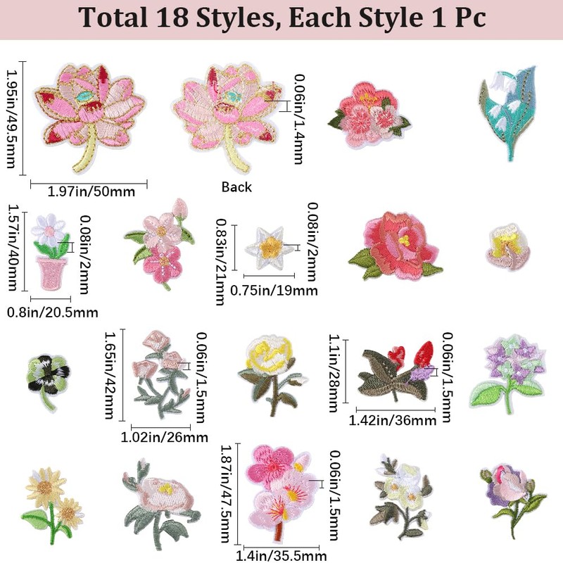 • 18 Styles Floral Embroidered Patch: These mini flower patches may be small, but vividly capture the true forms of various flowers like rose hydrangea sunflower daisy peach blossom lotus peony and can give you a feeling of being surrounded by a garden of flowers