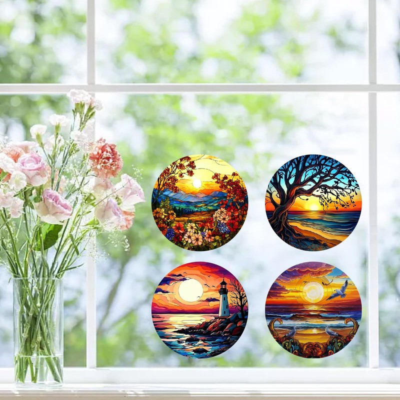 GORGECRAFT Pack of 4 4 Styles 16 cm Window Stickers with Sunset Plastic PVC Reusable Static Sunset Flowers Dead Tree Tower Bird Sticker for Windows and Doors Prevents Vo