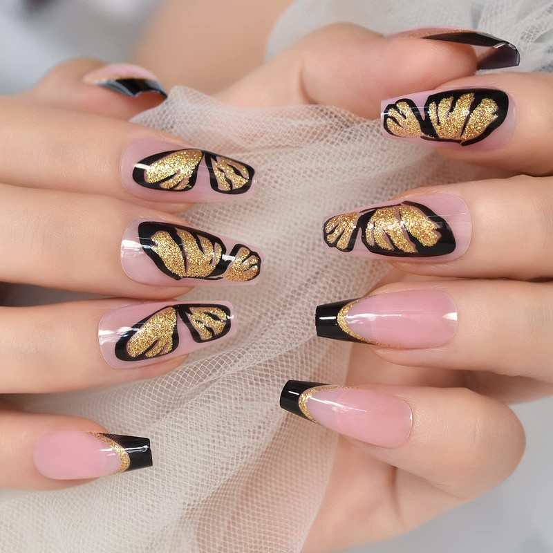 Gorgeous Gold Glitter Butterfly Press On Nails Large Image Designed Press On False Nails French Tips