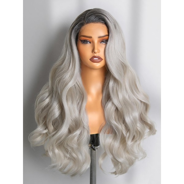 GORGIUS Silver Gray Loose Body Wave Lace Front Wig with Dark Root Pre Cut Synthetic Long Wavy Wig For Women 28 Inch