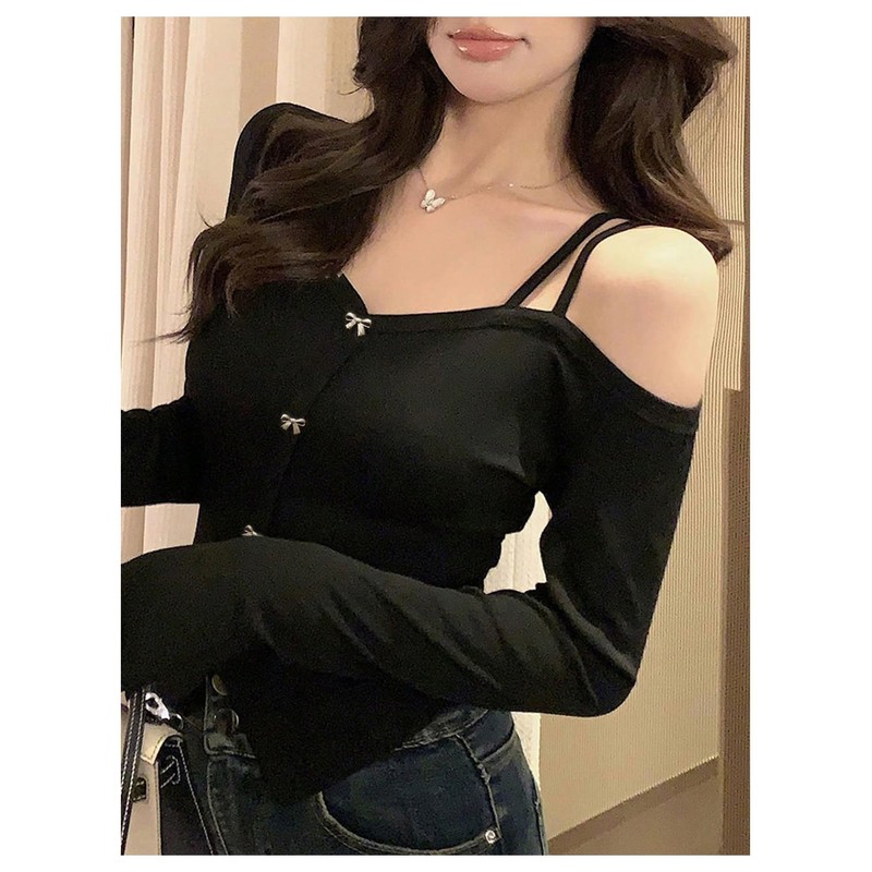 GORGLITTER Women's Asymmetrical Neck Bow T Shirts Cute Cold Shoulder Coquette Long Sleeve Going Out Tops Black Medium
