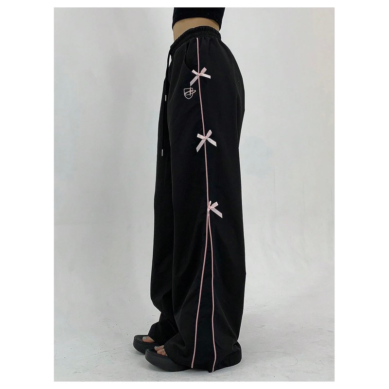- The wide leg coquette sweatpants feature contrasting bow-shaped stripes, which add a touch of charm and character to the sides of the legs