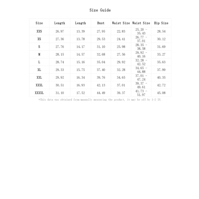 XS:Bust:29.5IN,Length:27.4IN,Waist Size:24.4IN,Hip Size:30.1IN,Length:13.8IN,Waist Size:26.8-37.0IN