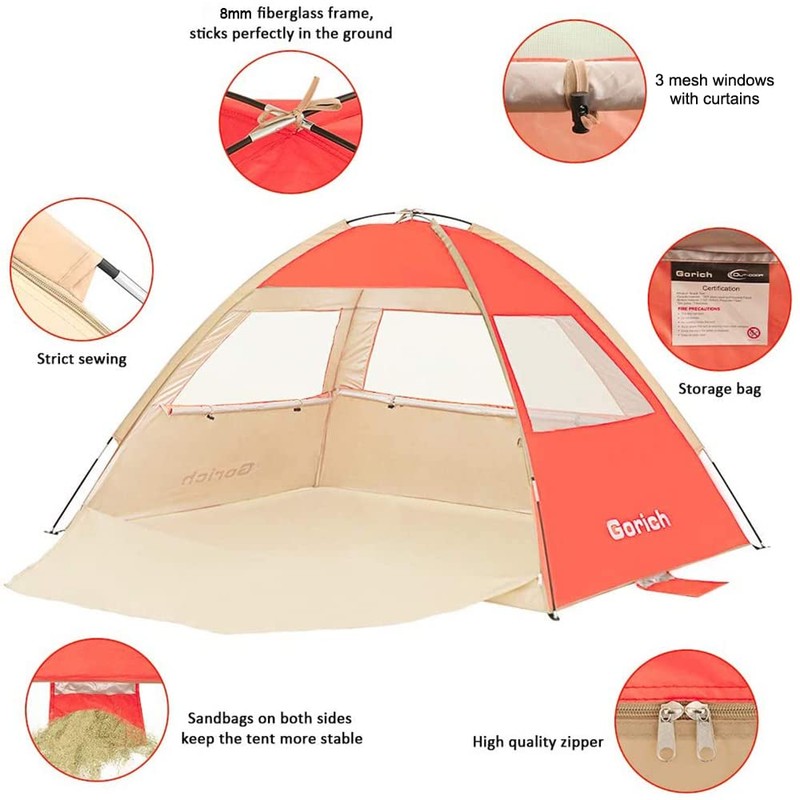 - Easy Set Up & Carry: Setting up fast within minutes. Gorich beach tent is much easier to fold than any kind of beach tents. It could fold down to a travel size of 17"H x 4"L x 4"W, weight 3.5 lbs, with a campact carrying bag that you even won’t notice it on your backpacks, much easy to carry