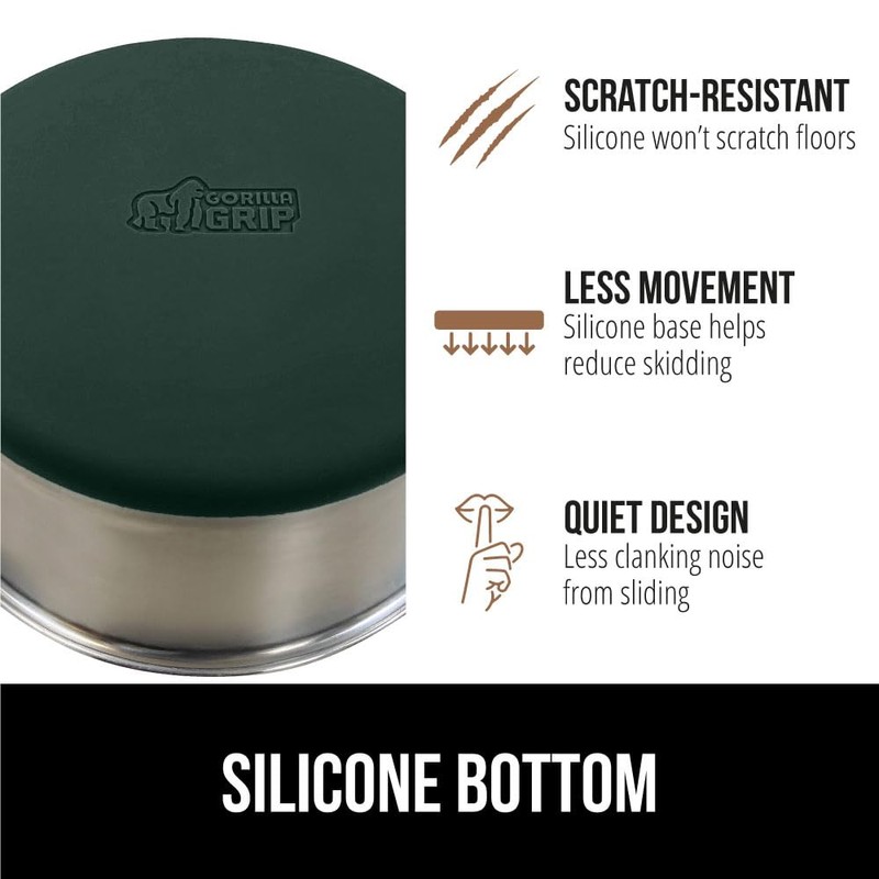 - SILICONE BOTTOM: the Gorilla Grip bowl is constructed from durable silicone that helps keep the bowl steady and won’t scratch your floors; while some over eager eaters may still be able to slide the bowls, the silicone will help prevent much movement; plus, it reduces the noise from clanking and sliding across wood, tile, and more