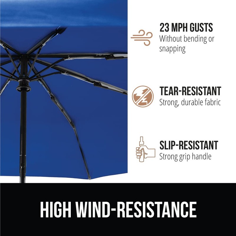 - HEAVY DUTY WIND RESISTANCE AND UV PROTECTION TESTED: the Gorilla Grip Umbrella is built for all weather durability; constructed with 8 reinforced fiberglass ribs and a tear-resistant canopy, the umbrella can tackle high winds without bending or snapping; windproof up to gusts of 23 mph; rust resistant for long lasting use; also provides protection from harmful UV rays up to 20 UPF