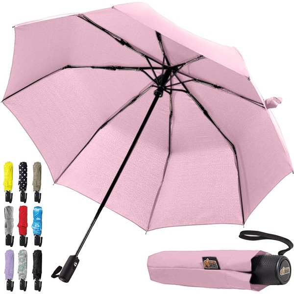 Gorilla Grip Windproof Compact Stick Umbrella for Rain, One-Click Automatic Open and Close, Strong Reinforced Fiberglass Ribs, Easily Collapsible, Lightweight Portable Umbrellas for Travel, Pink