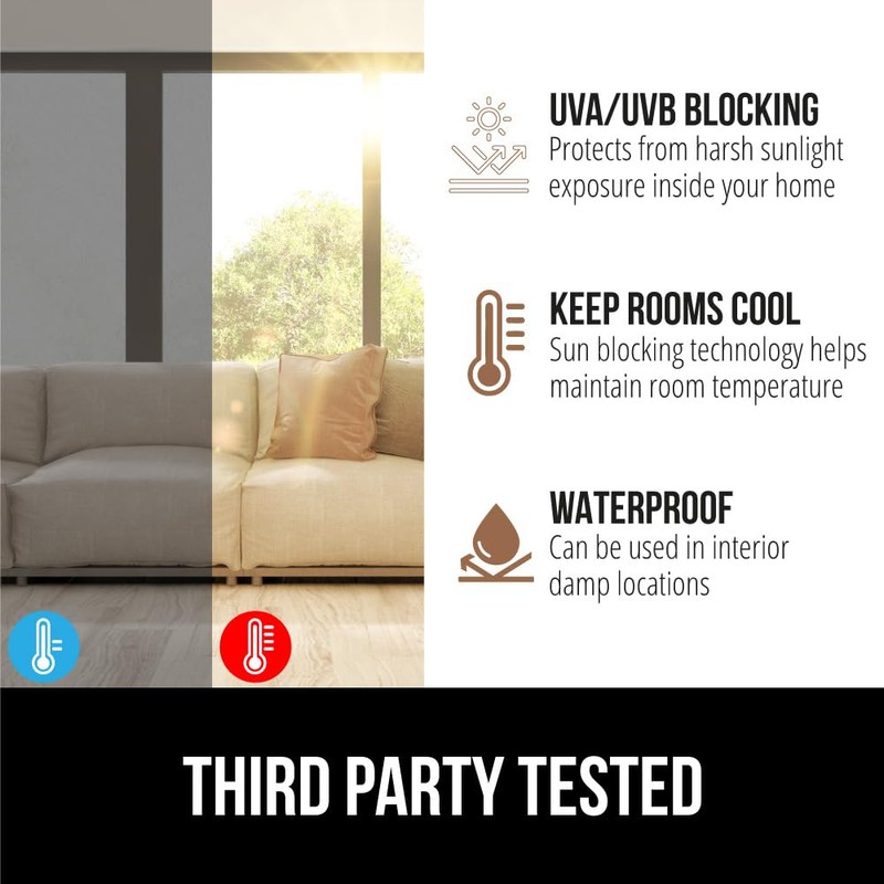 The Gorilla Guard Film is certified third party tested for UVA/UVB blocking. The film reduces glare and helps maintain a cooler room temperature in bathroom. Plus, it protects furniture from fading from direct sunlight exposure.